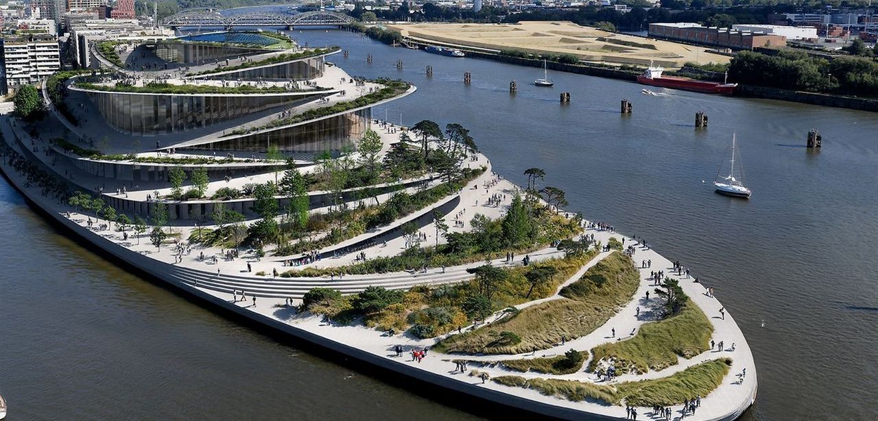 Die Architektur zeigt weitreichende Auskragungen, die eine Kaskade aus Balkonen bilden und fließend in eine Spirale von Dachgärten überführen. Die bepflanzten Ebenen enthalten ausschließlich heimische Gehölze und Gräser, die Insekten und Vögel anlocken sowie das Stadtklima verbessern. Dieser öffentliche Höhenpark verfügt über Sitzgelegenheiten, barrierearme Wege und Beschilderung. Er ermöglicht Besuchern ein Naturerlebnis mit Blick auf die HafenCity-Skyline, das Hafenbecken und das Ufer der Elbe. Informationspunkte erläutern Flora, Fauna, städtebauliche Zusammenhänge.